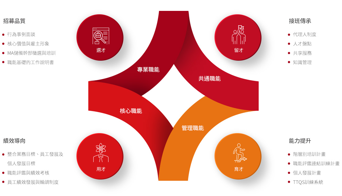 以職能模型為發展核心, 展開招募選才、能力發展、接班計畫及績效管理等運用。