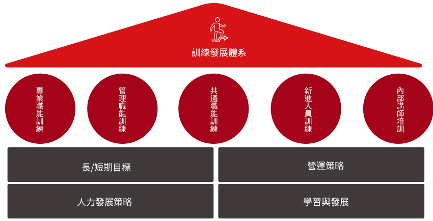 以職能模型為發展核心, 展開招募選才、能力發展、接班計畫及績效管理等運用。