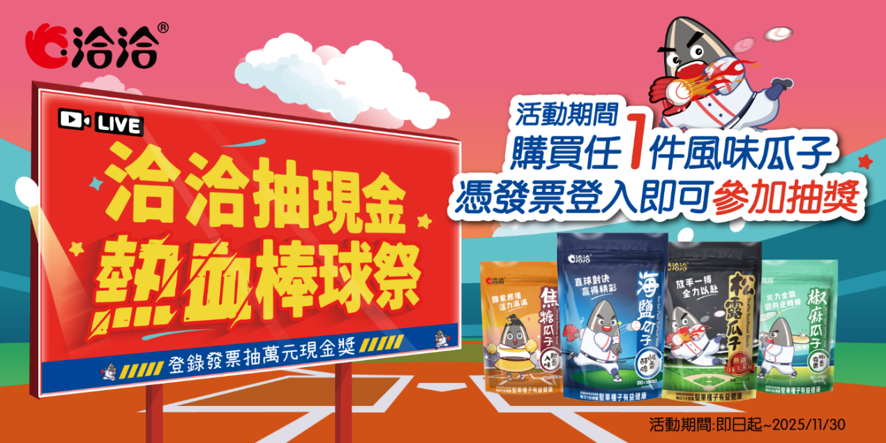味丹洽洽瓜子舉辦之《洽洽抽現金 熱血棒球祭》,於2025年8月11日至2025年11月30日止,活動期間凡購買洽洽風味瓜子商品(海鹽、松露、焦糖、椒麻瓜子)任一件,至活動官網或使用手機掃描貼紙QRcode登錄有購買洽洽活動指定商品之發票,即有機會抽到「壹萬元現金」及「全聯禮券2000元」。